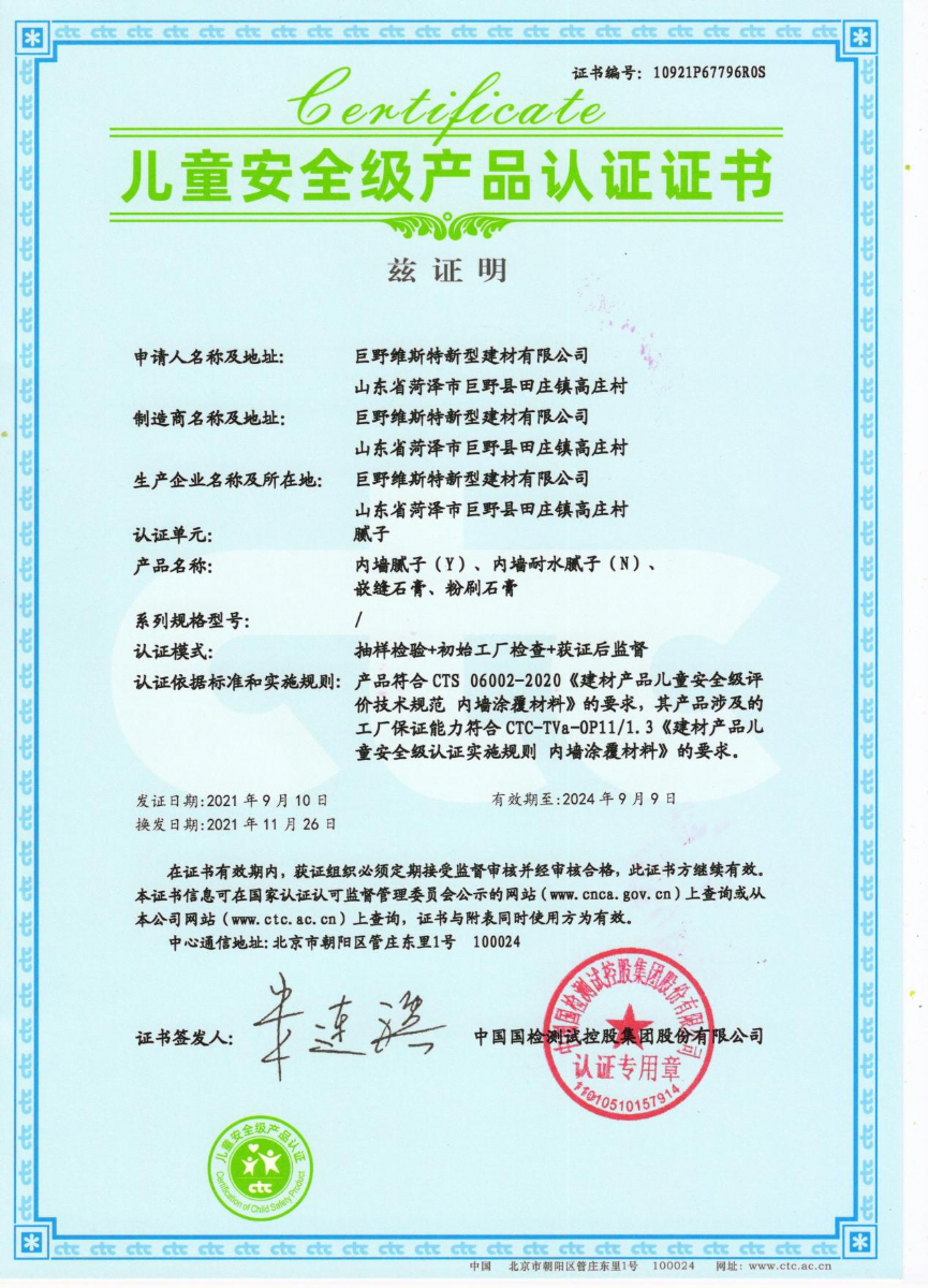 該系列通過中國建材中心頒發(fā)的“兒童安全級認證證書”。(該證書是行業(yè)內(nèi)第二個榮獲兒童安全認證產(chǎn)品),voc(揮發(fā)性有機化合物)、甲醛甲苯以及重金屬含量檢測標準要更加嚴格,產(chǎn)品符合《建材產(chǎn)品兒童安全級評價技術(shù)規(guī)范 內(nèi)墻涂覆材料》要求。